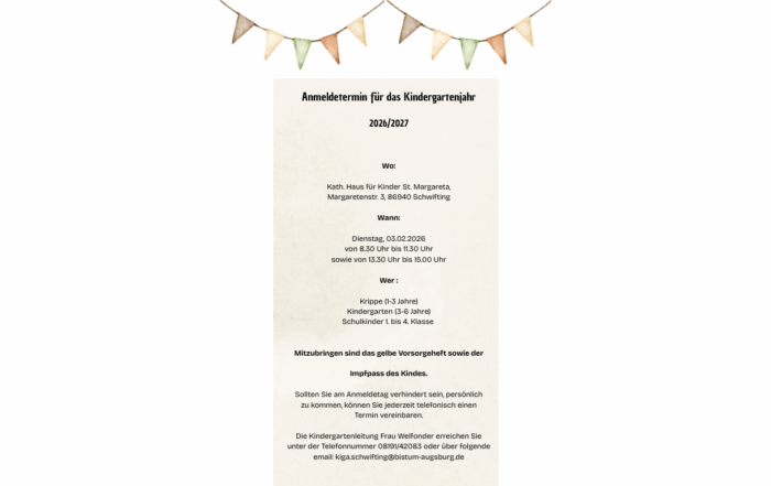 Die Anmeldung findet am Dienstag, 03.02.2026, von 8.30–11.30 Uhr und 13.30–15.00 Uhr bei uns in der Margaretenstr. 3 in Schwifting statt. (mehr …)