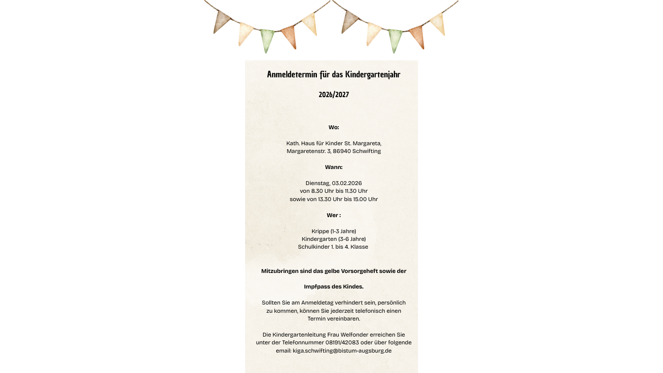 Wir freuen uns, Ihr Kind für das Kindergartenjahr 2026/2027 im Kath. Haus für Kinder St. Margareta begrüßen zu dürfen.